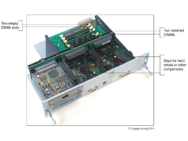 Upgrade the Printer Memory or Hard Drive • Internal hard drives hold print jobs and fonts • Extra memory can speed up memory performance, reduce print errors, prevent Out of Memory errors • General installation: • Use a screwdriver to remove printer cover plate • Remove thumb screws on the back of the printer, pull out the formatter board • Memory modules and hard installed on this board • Hard drive embedded on proprietary board that fits in the bay • Enable and configure using printer Properties window