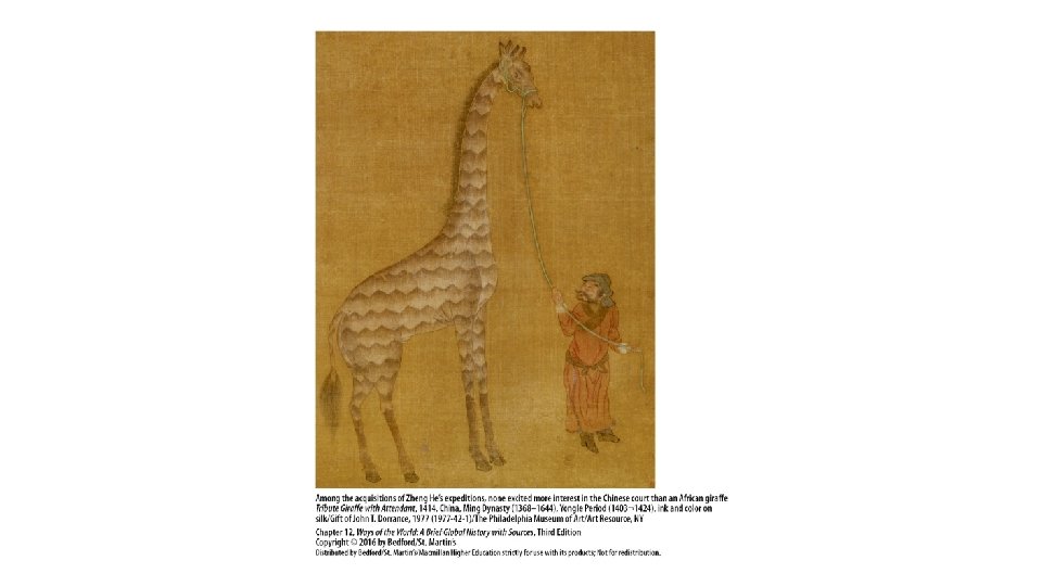 II. Civilizations of the Fifteenth Century: Comparing China and Europe 3. Economic boom a. As the Ming repaired infrastructure and fields damaged by the Mongols, the state set in motion substantial economic growth 4. Zheng He’s voyages (1405– 1433) a. One of the most remarkable moments in the Ming Dynasty were the massive fleets sponsored by Yongle and commanded by Admiral Zheng He. For several decades, hundreds of ships with 27, 000 men sailed the China seas and the Indian Ocean, demonstrating Chinese power. However, this was not a mission to colonize or conqueror, but rather a trade mission that encouraged the expansion of the tribute state system. The fleet was suddenly recalled and scuttled in the 1430 s, and the Ming turned away from sending merchants out to the world and, instead, let the world come to China.