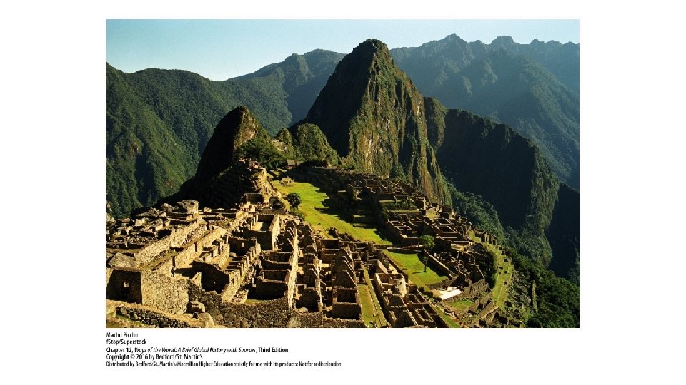 IV. Civilizations of the Fifteenth Century: The Americas B. The Inca Empire 1. 2, 500 miles and 10, 000 subjects a. The Inca were similar to the Aztec in that they were a small marginal group that came to rule a large empire and used previous precedents to justify their rule, but the Inca had a much larger territory than the Aztec. 2. State bureaucracy, resettlement, and Quechua a. The Inca had a much more developed and invasive state bureaucracy than the Aztecs, who generally left their people alone. The Inca resettled large numbers of conquered people and encouraged the use of Quechua as a language.