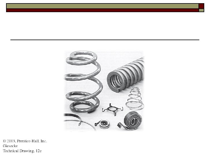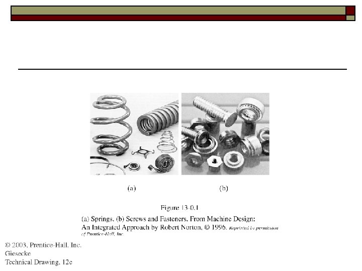 OBJECTIVES 1. Define and label the parts of a screw thread. 2. Identify various screw thread forms. 3. Draw detailed, schematic, and simplified threads. 4. Define typical thread specifications. 5. Identify various fasteners and describe their use. 6. Draw various screw head types. 7. Draw springs.