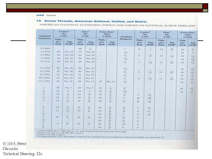Thread Notes o ASME/ANSI Y 14. 6 -2001 “Screw Thread Representations” is a standard for representing, specifying, and dimensioning screw threads on drawings n These same notes or symbols are used in correspondence, in records, and in specifications for parts, taps, dies, tools, and gages