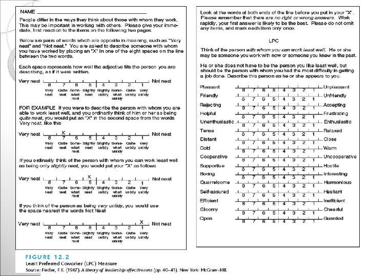 Contingency Theories of Leadership ◦ To assess leaders’ task or relationship orientation, leaders use the Least Preferred Coworker (LPC) scale to rate their most difficult follower. Persons who give their least preferred coworkers very harsh ratings (low LPC scores) are task-oriented leaders. Persons who rate their least preferred coworker somewhat leniently (higher LPC scores) are considered to be relationshiporiented.