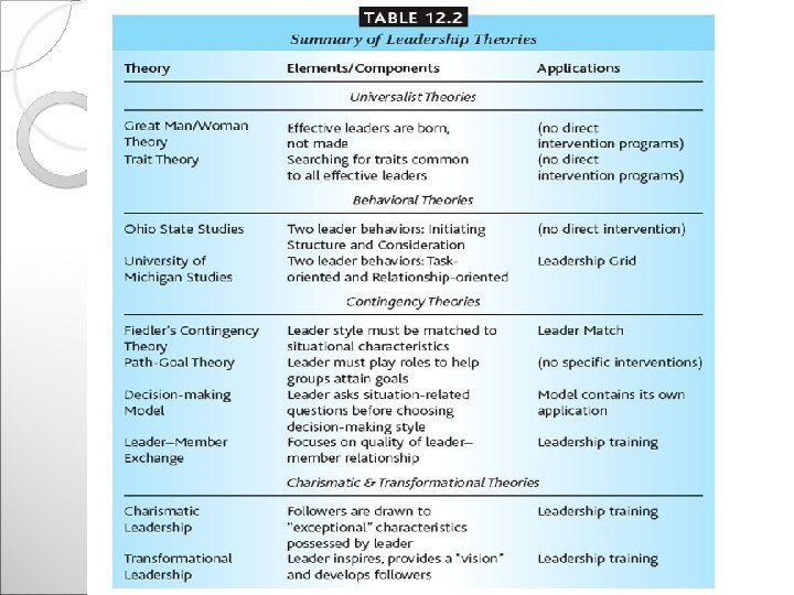 Universalist Theories of Leadership ◦ Research indicates that extraversion, conscientiousness, openness to experience, agreeableness, and emotional stability, in combination, are associated with effective leadership (Bono and Judge, 2004). ◦ Possession of flexibility, charisma, and social intelligence are also important for leadership (Riggio, 1986). ◦ The major problem with the original trait approach is that it was too general.