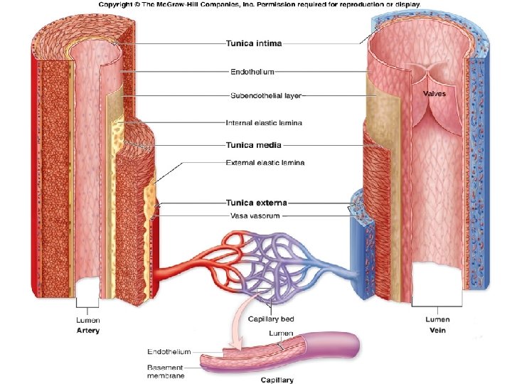 Blood Vessels • Capillaries – ________ of blood vessels – Only one cell thick (epithelial cell) – Connect arteries to veins – Bring oxygen and nutrients to cells – Removes CO 2, urea, and other wastes from cells – Where blood is under low pressure and moving ________