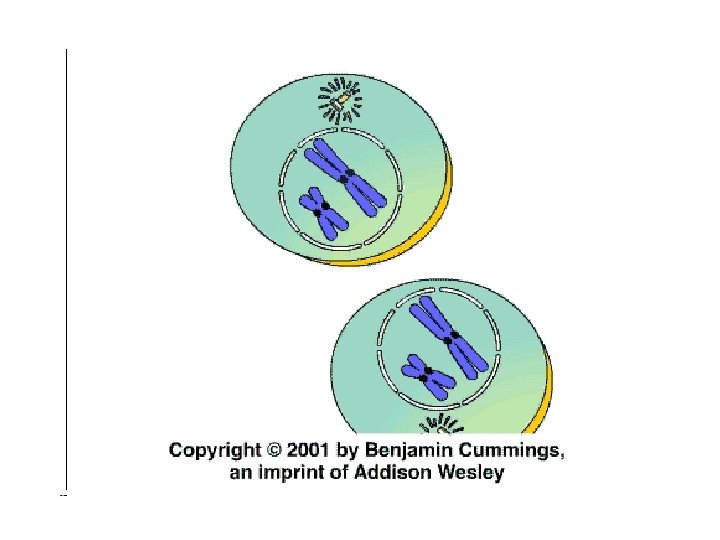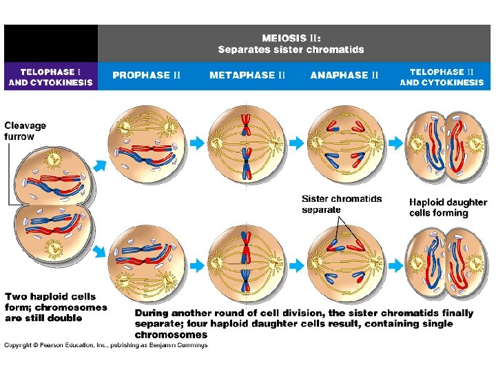 6. Prophase II - Spindle begins to form 7. Metaphase II - Chromosomes align at the metaphase plate - Kinetochores attach to microtubules leading to centrioles 8. Anaphase II - Sister chromatids separate - Chromosomes are pulled to opposite ends of the cell 9. Telophase II and Cytokinesis - Nuclei form around chromosomes - Cytoplasm divides to form two (2) cells Then end result is: From one cell we have created four (4) haploid (1 n) daughter cells with unreplicated chromosomes