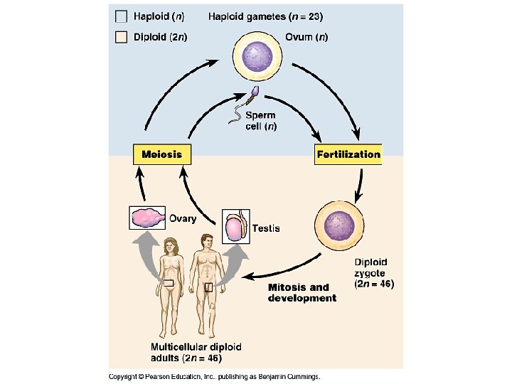 - Diploidy (where 2 n = 46) arises when a sperm cell fertilizes an egg cell. A fertilized egg is called a zygote. 1 n (♀) + 1 n (♂) = 2 n - The zygote grows and the cell divides again and again to create the mature adult. All somatic cells undergo mitosis for this process (See Chapter 12). - Eventually, the adult will form either sperm or eggs (which are 1 n); and the process starts over again. - The process by which haploid cells are produced is called meiosis. Note: if somatic cells did not undergo meiosis in producing sperm and egg cells, the next generation would contain double the number of chromosomes in a somatic cell (4 n). Thus, meiosis is a vital process in reproduction to keep the chromosome number correct! Please memorize Figure 13. 5 (p. 241) – The human life cycle.