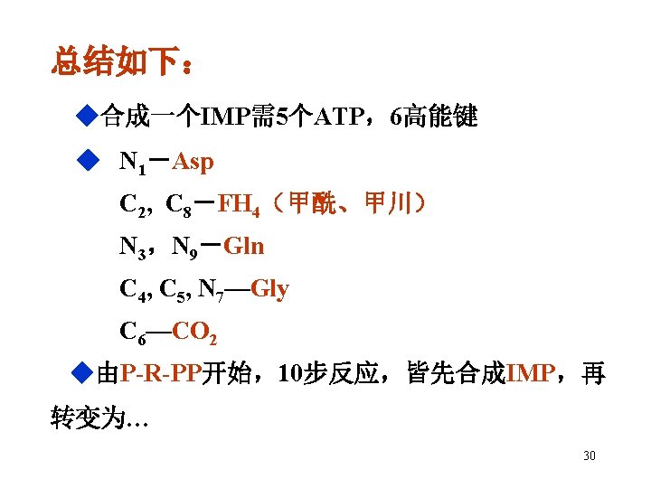 • 过程: PRPP合成酶 5 -磷酸核糖+ATP PRPP+AMP Asp Gly Gln One C unit CO 2 1 IMP 2 AMP GMP 32