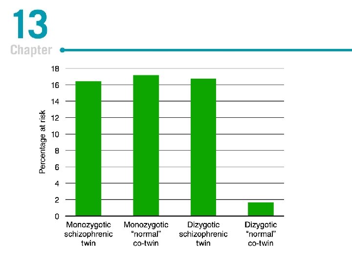 Causes of Schizophrenia: Findings From Genetic Research Adoption studies § Adoptee risk for developing schizophrenia remains high if a biological parent has schizophrenia § But risk is lower than for children raised by their biological parent with schizophrenia – healthy environment is a protective factor