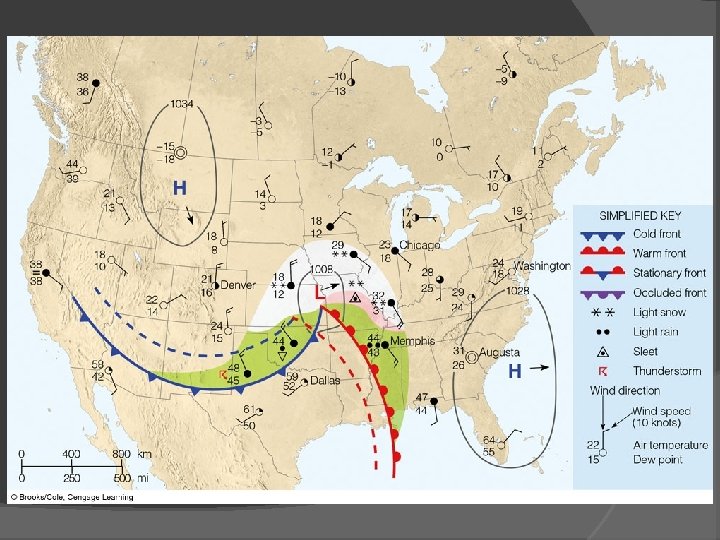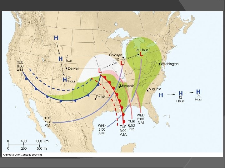 Weather Forecasting Using Surface Charts Observation: Advection Winds that back with height indicate cold advection (counterclockwise) and vice versa Movement of Weather Systems 1. Mid-lat cyclones move in same direction and speed as previous 6 hrs 2. Lows move in direction parallel the isobars in the warm air ahead of the cold front 3. Lows move toward region of greatest pressure drop