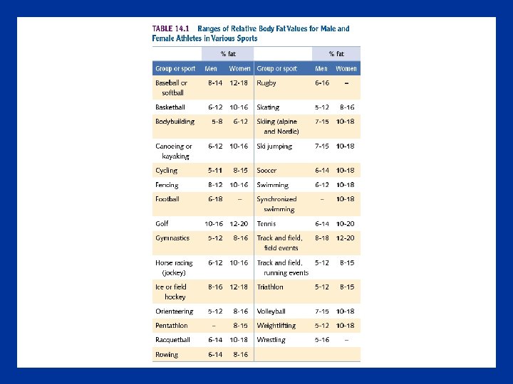 Body Composition and Performance: Body Fat Relative Body Fat • A high relative body fat is generally detrimental to performance • Maintaining a low body fat is desirable in sports in which the body weight is moved through space (e. g. , running and jumping) • Increases in body fat might possibly be of benefit for: – Heavyweightlifters because it lowers their center of gravity – Sumo wrestlers – Swimmers because fat improves buoyancy