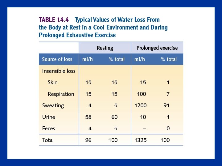 Water Balance at Rest • • • Water intake equals output Intake averages 33 ml/kg per day Avenues of water loss 1. Evaporation from the skin 2. Evaporation from the respiratory tract 3. Excretion from the kidneys 4. Excretion from the large intestines