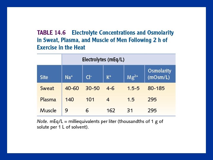Electrolyte Balance During Exercise • Loss of large amounts of water can disrupt electrolyte balance • Electrolytes in sweat are rather dilute • Sodium and chloride are the most abundant electrolytes in sweat • Excess electrolytes are excreted in the urine during rest, but less so during exercise • Dehydration causes aldosterone to promote renal retention of sodium and chloride ions, increasing their concentrations in the blood • Increased blood osmolality triggers thirst in an effort to make us consume more fluid