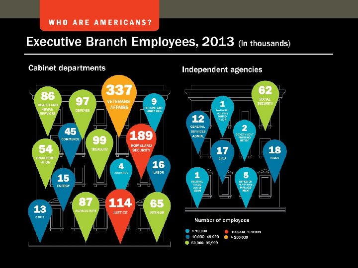 Organization of the Executive Branch • The basic operational unit is the agency. – Sometimes called a bureau, service, or administration – Examples: • Federal Bureau of Investigation (Justice) • Secret Service (Homeland Security) • Food and Drug Administration (Health and Human Services)