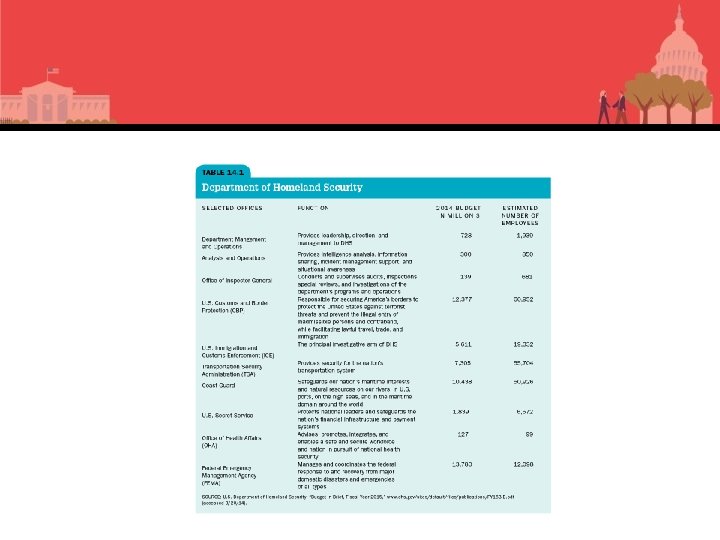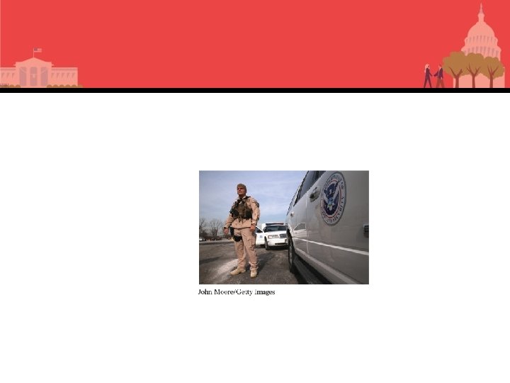 Providing National Security: Agencies • Agencies for internal security – In 2002, Congress created the Department of Homeland Security, a massive restructuring of the U. S. national security bureaucracy. • Security, immigration services and enforcement, privacy law, transportation, and intelligence elements are linked in different ways within this agency.
