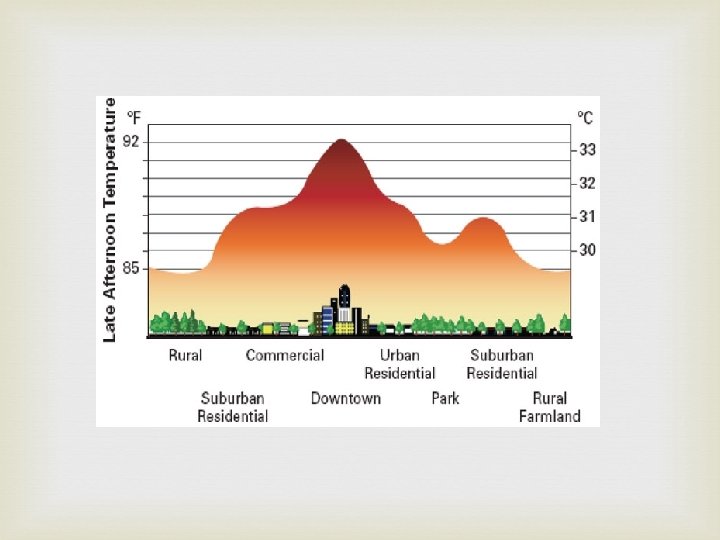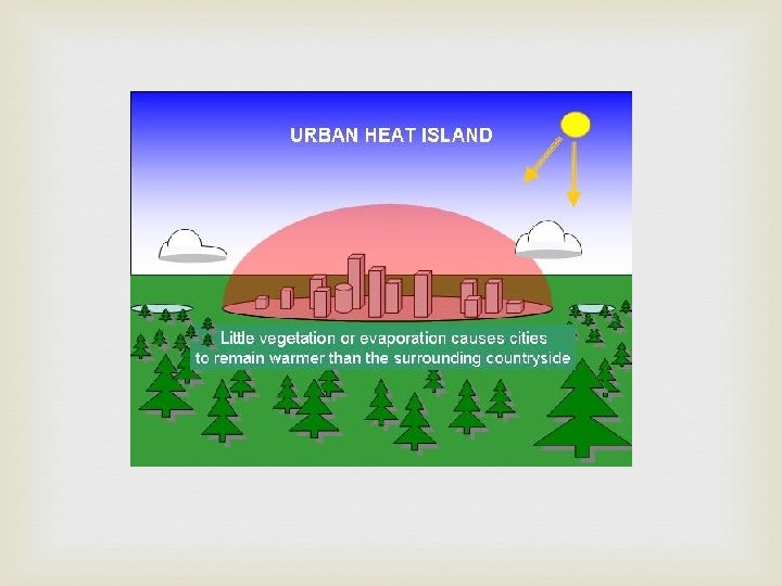 Other Impacts of Urbanization Cities generate and trap more heat than the countryside. Heat island - the increased temperature in the city. Concrete retains more heat than vegetation. Heat is generated by the infrastructure Heat islands affect local weather patterns Hot air rises and produces rain clouds.