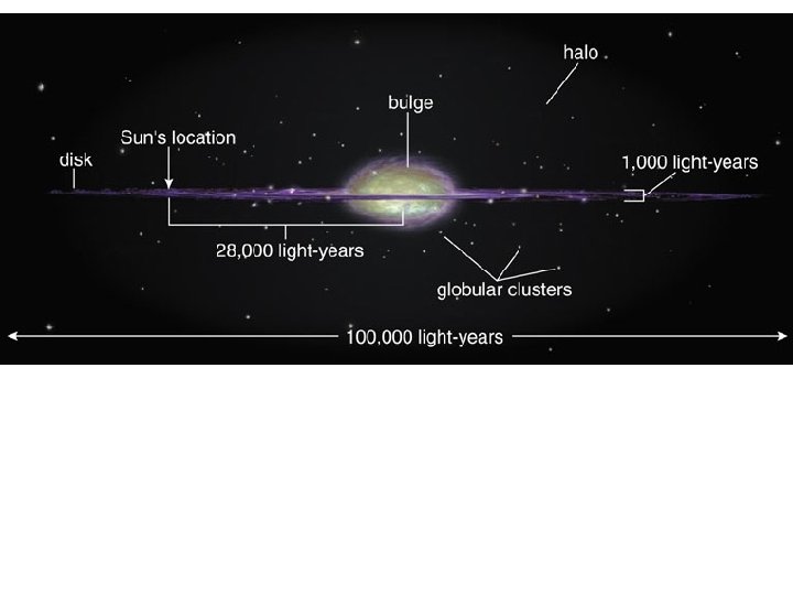 What have we learned? • What does our galaxy look like? • The Milky Way Galaxy consists of a thin disk about 100, 000 light-years in diameter with a central bulge and a spherical region called the halo that surrounds the entire disk. The disk contains the gas and dust of the interstellar medium, while the halo contains very little gas.