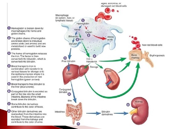 (1) (2) (3) (4) (5) (6) (7) Macrophages in spleen, liver, and red bone marrow through the process of phagocytosis rupture worn-out red blood cells splitting apart the globin and heme portions of hemoglobin. Globin broken down into amino acids (to be used in protein synthesis). Iron removed from heme portion associates with plasma protein called transferrrin. Iron-transferrin complex goes to red bone marrow for RBC precursor cells to use in hemoglobin synthesis. � IRON NEEDED FOR HEME PORTION OF HEMOGLOBIN, AMINO ACID NEEDED FOR GLOBIN. ◦ Also needed: Vitamin B 12_ and Intrinsic factor. � Intrinsic Factor protein produced in stomach lining Erythropoiesis is the process in red bone marrow that results in production of new red blood cells. Iron removed from heme, non-iron portion converted to hiliverdin, a green pigment, and then into bilirubin, a yellow-orange pigment. Bilirubin enters blood and is transported to the liver, where it is secreted into bile. Bile goes to small intestine then large intestine. Bacteria in large intestine converts bilirubin into urobilinogen, which is absorbed back into the blood, and converted to a yellow pigment called urobilin, which is excreted in urine. Urobilinogen is eliminated in feces in the form of a brown pigment called stercobilin.