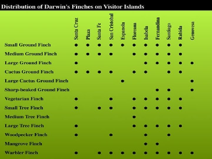 • Intriguing to biologists - how the different species evolved • Genetic analysis suggests all 13 species evolved from a flock of about 30 • Probably arriving millions of years ago