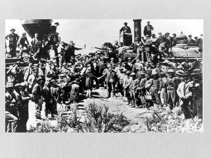 Railroads Expand Transcontinental Railroad • railroad built in the 1860 s that spanned the entire United States • Two railway companies: • Union Pacific (laid westward tracks) • Central Pacific (laid eastward tracks). • Met at Promontory Point in Utah.