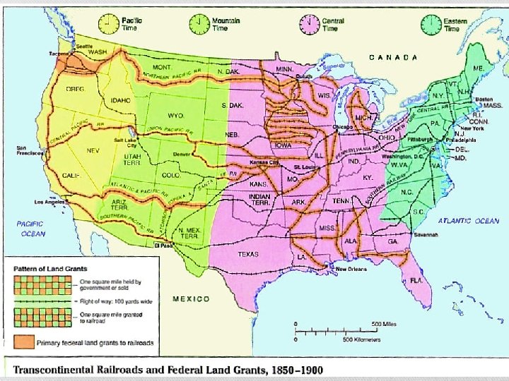 • Effects of Expansion • Economic: Railroads promoted trade and provided jobs, gave boost to steel and manufacturing. • Social: Sped up the settlement of the West, new towns created and existing towns became cities. • Development of standard time, or time zones to keep railroads on a timely schedule (1883).