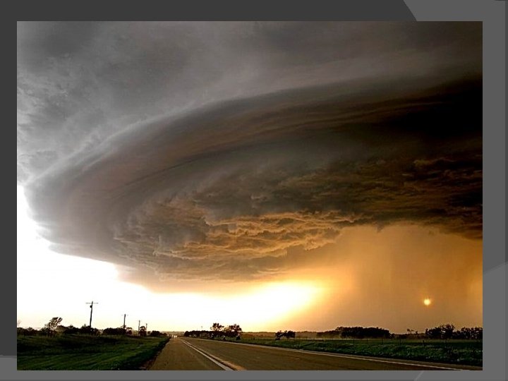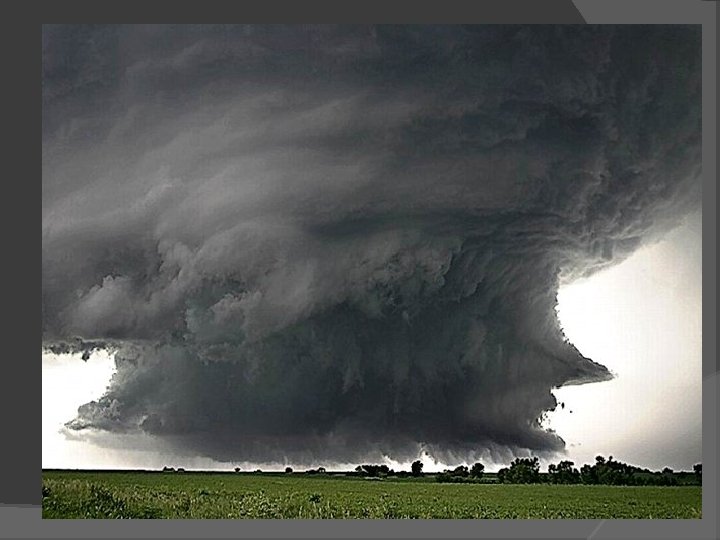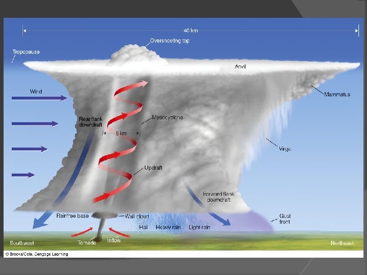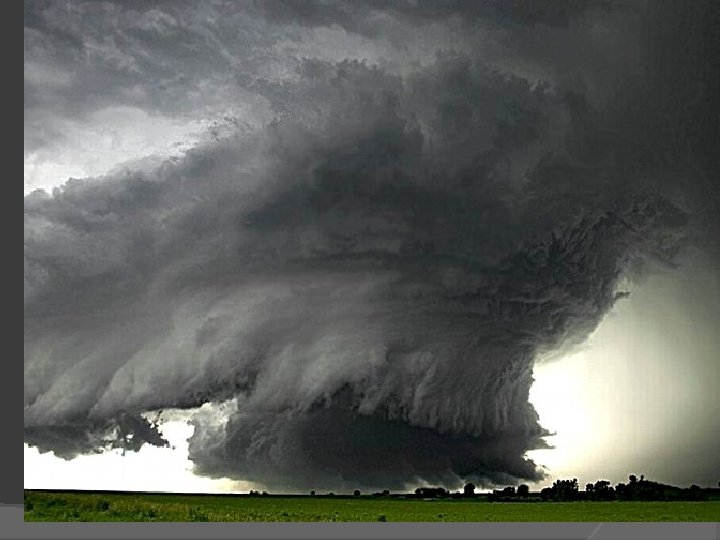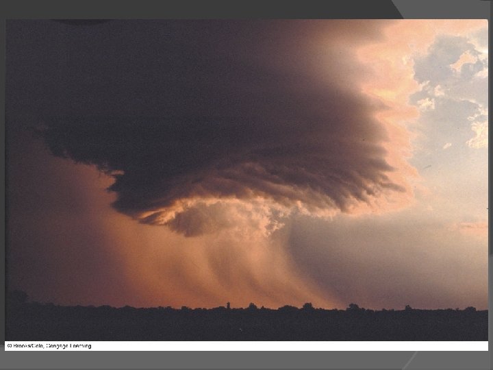 Thunderstorms Supercell thunderstorms Large, long-lasting thunderstorm with a single rotating updraft Strong vertical wind shear Outflow never undercuts updraft Classic, high precipitation and low precipitation supercells Rain free base