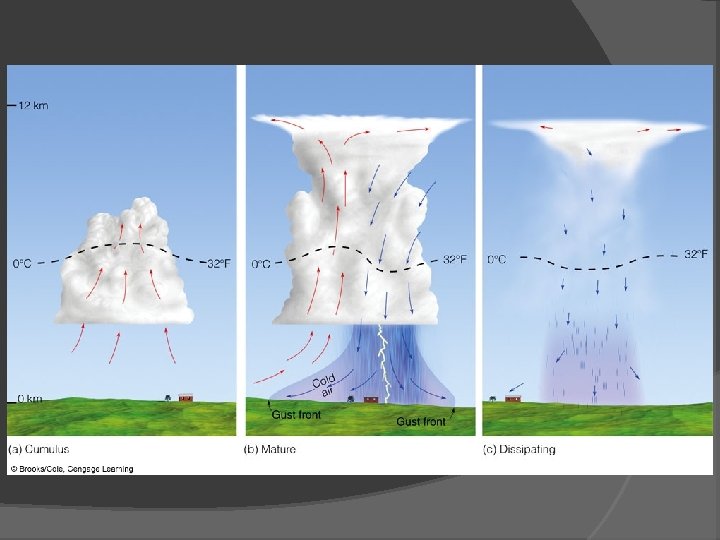 Thunderstorms A storm containing lightening and thunder; convective storms may have heavy rain hail Ordinary Cell Thunderstorms Air-mass thunderstorms: limited wind sheer Stages: cumulus, mature, dissipating Entrainment, downdraft, gust front