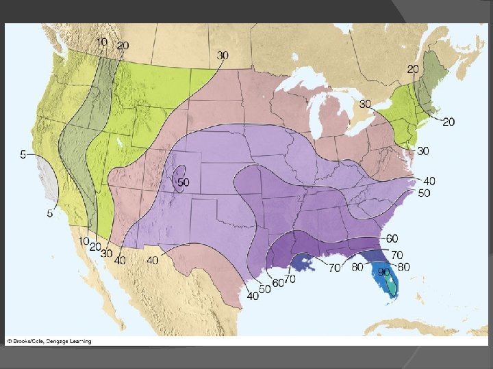 Thunderstorms Distribution of Thunderstorms Most frequent Florida, Gulf Coast, Central Plains Fewest Pacific coast and Interior valleys Most frequent hail Central Plains