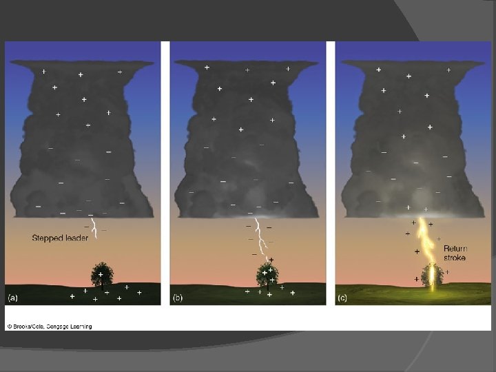 Thunderstorms The Lightening Stroke Positive charge typically on ground, cloud to ground lightening Stepped leader, ground stroke, forked lightening, ribbon lightening, bead lightening, corona discharge