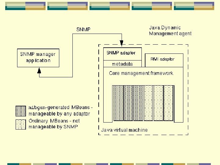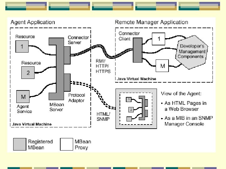 JDMK • Java dynamic management tool kit to build Javabased NMS • MBean is an intelligent agent; does not need polling as in SNMP agent • JDMK library of core management services implemented as MBeans • Java Dynamic Management agent comprises • MBeans: MBeans core management framework, MBean server • Protocol adaptors: adaptors interfaces to applications