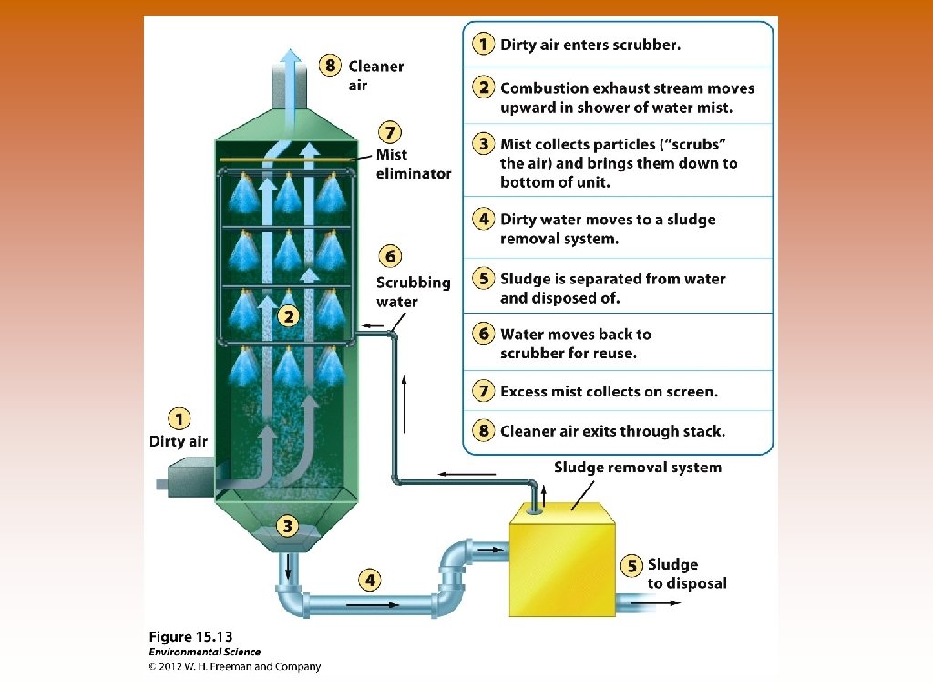 The scrubber Air Pollution control device Uses water droplets over the exhaust stream to create a “sludge” that is collected and processed for disposal.