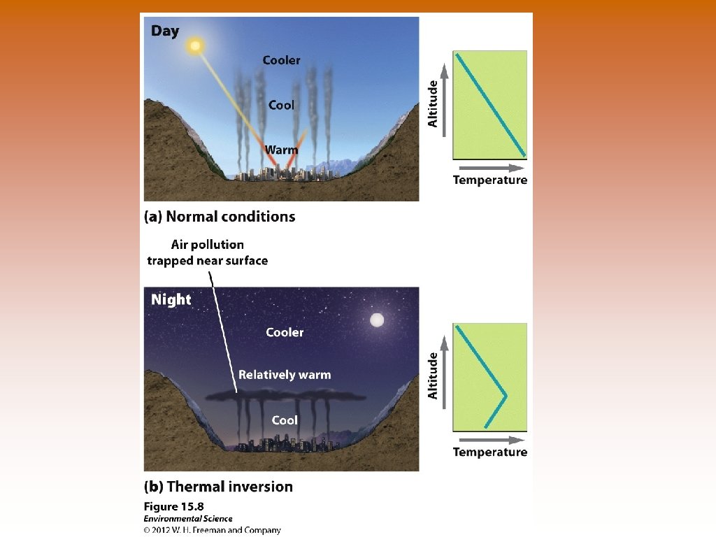 Thermal Inversions © Thermal Inversion- when a relatively warm layer of air at mid-altitude covers a layer of cold, dense air below. © The warm inversion layer traps emissions that then accumulate beneath it.