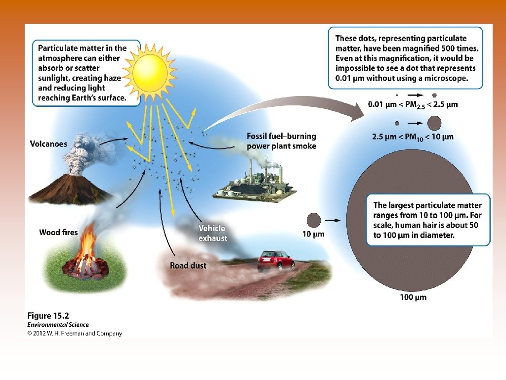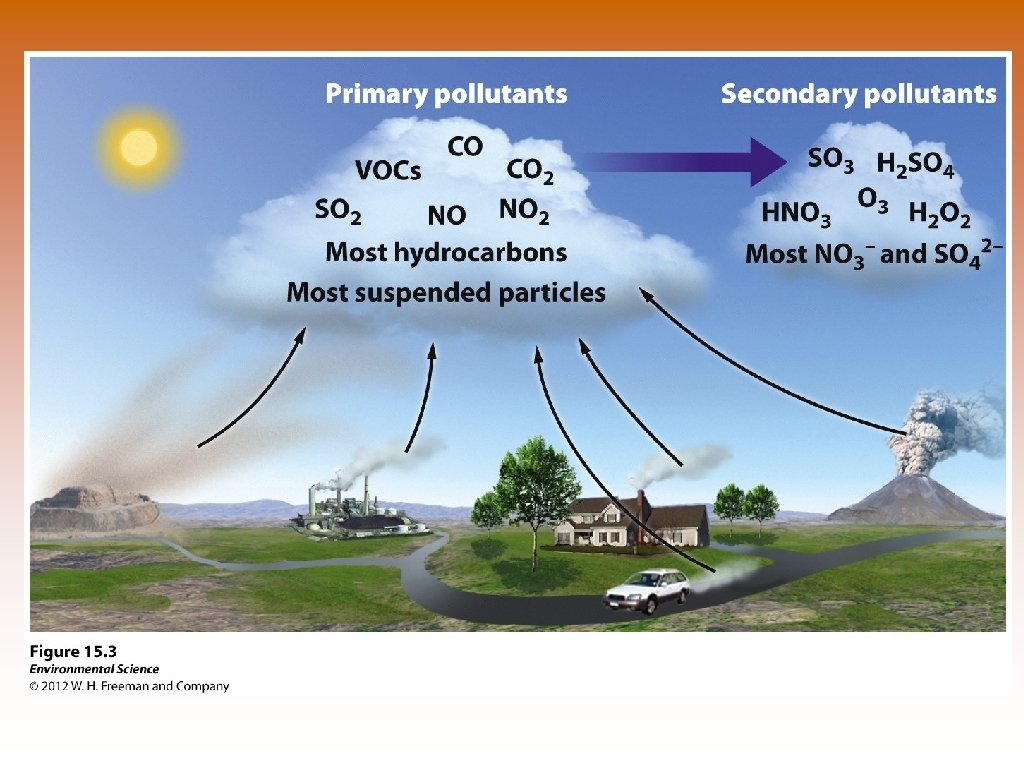 Primary Pollutants © Primary pollutants- polluting compounds that come directly out of the smoke-stack, exhaust pipe, or natural emission source. © Examples: CO, CO 2, SO 2, NOx, and most suspended particulate matter. Secondary Pollutants © Secondary pollutants- pollutants that have undergone transformation in the presence of sunlight, water, oxygen, or other compounds. © Examples: ozone, sulfate and nitrate