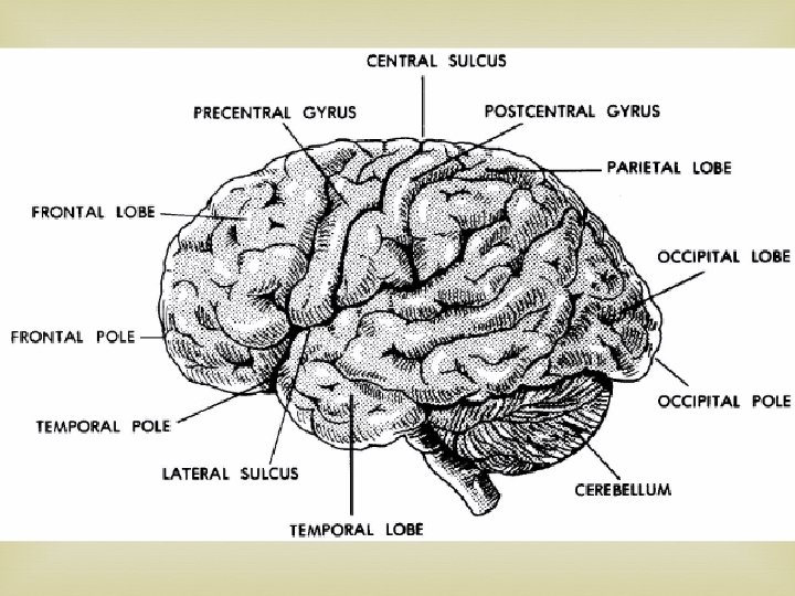 Cont. Cerebellum: the “little brain” tucked under the cerebrum, and important in the control of balance, posture, and voluntary movement. Cerebrum: the largest part of the human brain, which is split into left and right hemispheres. Seat of all “higher” brain functions. Paleoneurology: the study of the evolution of brain structure and function. Encephalization quotient (EQ): the ratio of the actual brain size of a species to its expected brain size based on statistical regression of brain-to-body size based on a large number of species.
