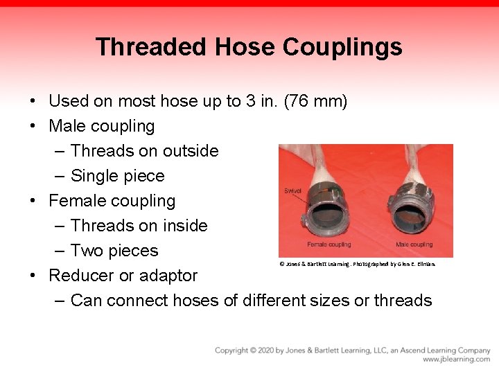 Threaded Hose Couplings • Used on most hose up to 3 in. (76 mm) • Male coupling – Threads on outside – Single piece • Female coupling – Threads on inside – Two pieces • Reducer or adaptor – Can connect hoses of different sizes or threads © Jones & Bartlett Learning. Photographed by Glen E. Ellman.