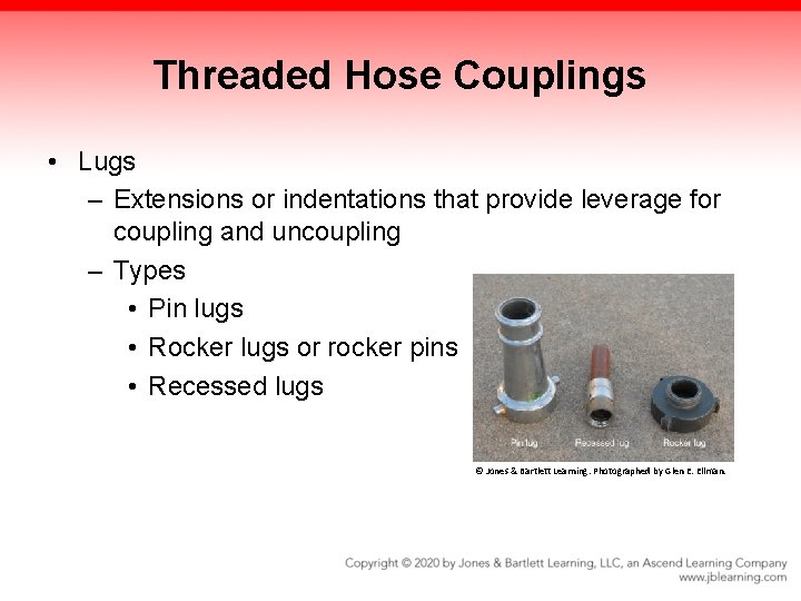 Threaded Hose Couplings • Lugs – Extensions or indentations that provide leverage for coupling and uncoupling – Types • Pin lugs • Rocker lugs or rocker pins • Recessed lugs © Jones & Bartlett Learning. Photographed by Glen E. Ellman.