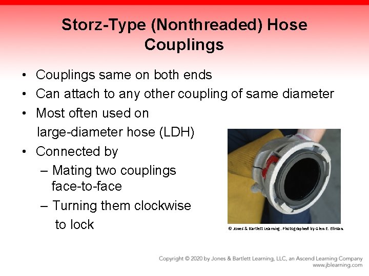 Storz-Type (Nonthreaded) Hose Couplings • Couplings same on both ends • Can attach to any other coupling of same diameter • Most often used on large-diameter hose (LDH) • Connected by – Mating two couplings face-to-face – Turning them clockwise to lock © Jones & Bartlett Learning. Photographed by Glen E. Ellman.