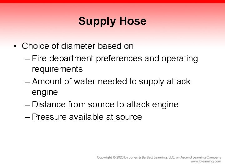 Supply Hose • Choice of diameter based on – Fire department preferences and operating requirements – Amount of water needed to supply attack engine – Distance from source to attack engine – Pressure available at source
