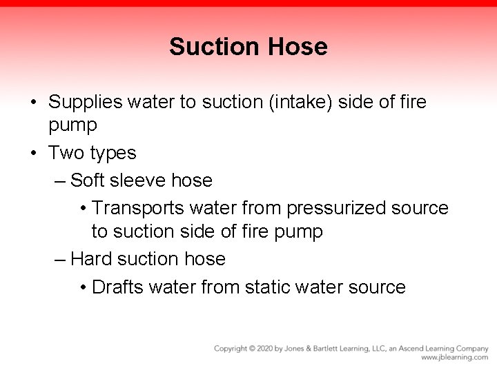 Hard Suction Hose • Short section of rigid hose that drafts water from static source or carries water from fire hydrant to pumper • 10 -ft. (3 -m) or 20 -ft (6 -m) sections • Diameter up to 6 in. (152 mm) • Made of rubber or plastic • Long handles on female couplings for tightening hose © Jones & Bartlett Learning. Photographed by Glen E. Ellman.