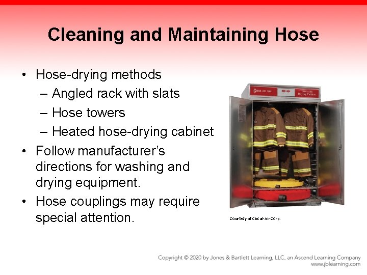 Cleaning and Maintaining Hose • Hose-drying methods – Angled rack with slats – Hose towers – Heated hose-drying cabinet • Follow manufacturer’s directions for washing and drying equipment. • Hose couplings may require special attention. Courtesy of Circul-Air Corp.
