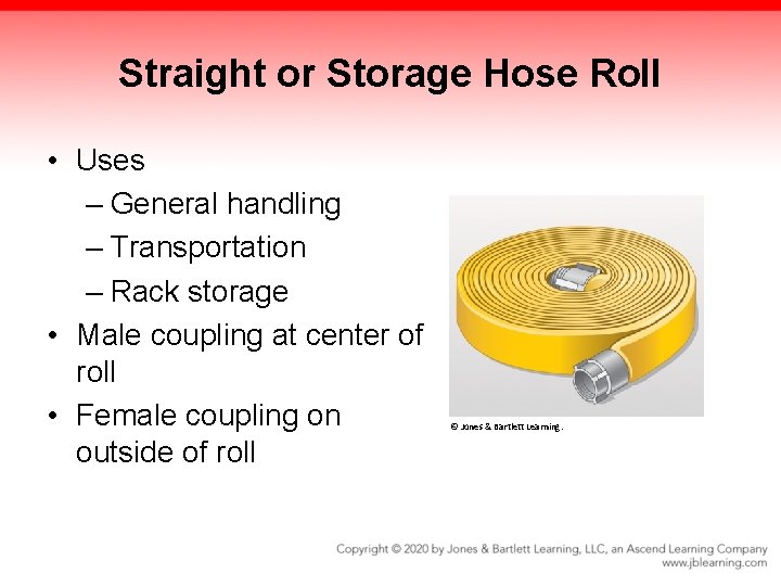 Straight or Storage Hose Roll • Uses – General handling – Transportation – Rack storage • Male coupling at center of roll • Female coupling on outside of roll © Jones & Bartlett Learning.
