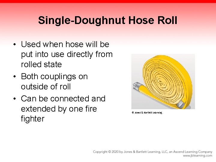Single-Doughnut Hose Roll • Used when hose will be put into use directly from rolled state • Both couplings on outside of roll • Can be connected and extended by one fire fighter © Jones & Bartlett Learning.