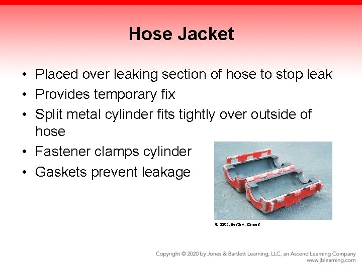 Hose Jacket • Placed over leaking section of hose to stop leak • Provides temporary fix • Split metal cylinder fits tightly over outside of hose • Fastener clamps cylinder • Gaskets prevent leakage © 2003, Berta A. Daniels
