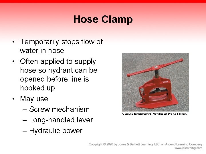 Hose Clamp • Temporarily stops flow of water in hose • Often applied to supply hose so hydrant can be opened before line is hooked up • May use – Screw mechanism – Long-handled lever – Hydraulic power © Jones & Bartlett Learning. Photographed by Glen E. Ellman.
