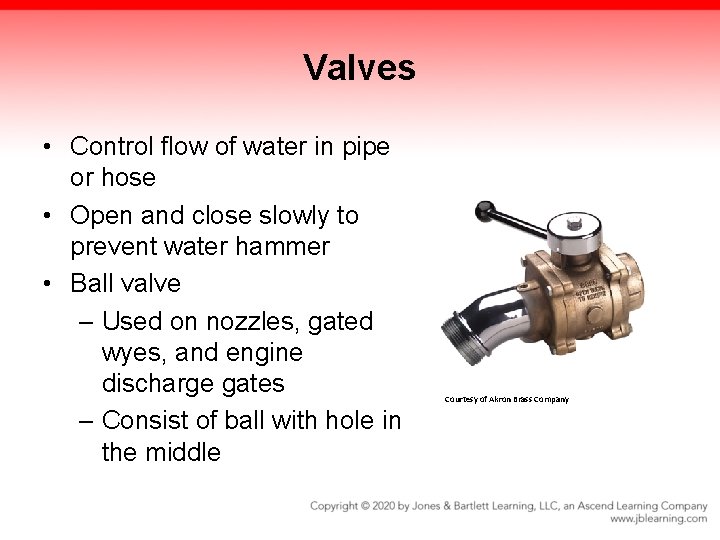 Valves • Control flow of water in pipe or hose • Open and close slowly to prevent water hammer • Ball valve – Used on nozzles, gated wyes, and engine discharge gates – Consist of ball with hole in the middle Courtesy of Akron Brass Company