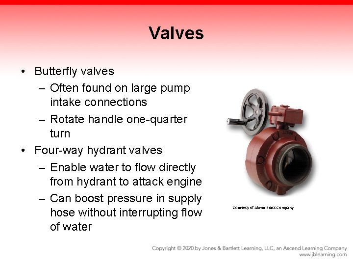 Valves • Butterfly valves – Often found on large pump intake connections – Rotate handle one-quarter turn • Four-way hydrant valves – Enable water to flow directly from hydrant to attack engine – Can boost pressure in supply hose without interrupting flow of water Courtesy of Akron Brass Company