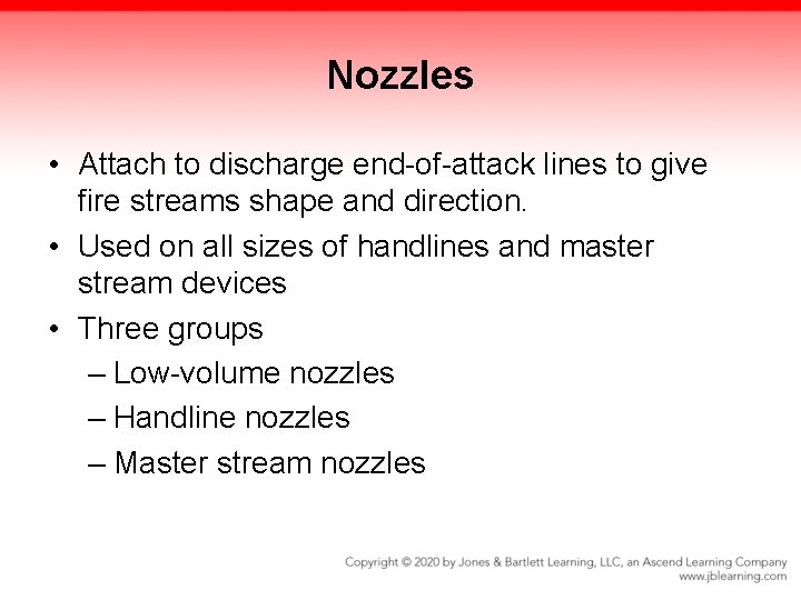 Nozzles • Attach to discharge end-of-attack lines to give fire streams shape and direction. • Used on all sizes of handlines and master stream devices • Three groups – Low-volume nozzles – Handline nozzles – Master stream nozzles