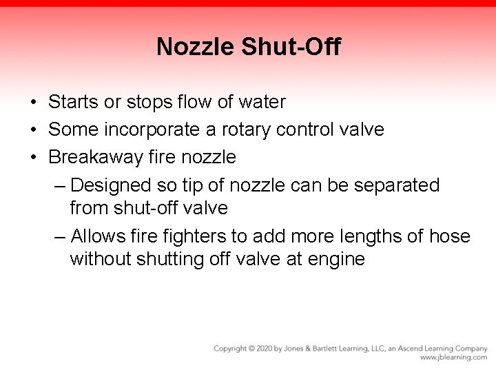 Nozzle Shut-Off • Starts or stops flow of water • Some incorporate a rotary control valve • Breakaway fire nozzle – Designed so tip of nozzle can be separated from shut-off valve – Allows fire fighters to add more lengths of hose without shutting off valve at engine
