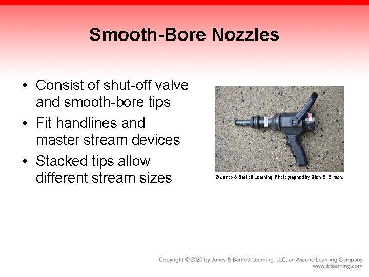 Smooth-Bore Nozzles • Consist of shut-off valve and smooth-bore tips • Fit handlines and master stream devices • Stacked tips allow different stream sizes © Jones & Bartlett Learning. Photographed by Glen E. Ellman.