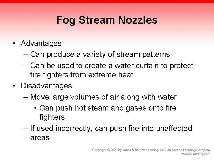 Fog Stream Nozzles • Produce fine droplets that absorb more heat per gallon than straight stream • Can be used to reduce room temperature to prevent flashover • Cannot produce solid stream © Jones & Bartlett Learning. Photographed by Glen E. Ellman.