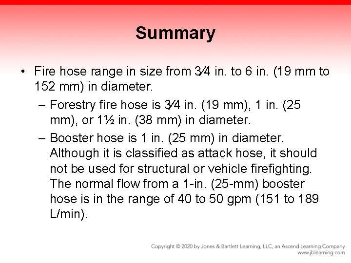 Sizes of Hose • Range from ¾ in. to 6 in. (19 mm to 152 mm) • Nominal hose size – Inside diameter of hose filled with water © Jones & Bartlett Learning. Photographed by Glen E. Ellman.